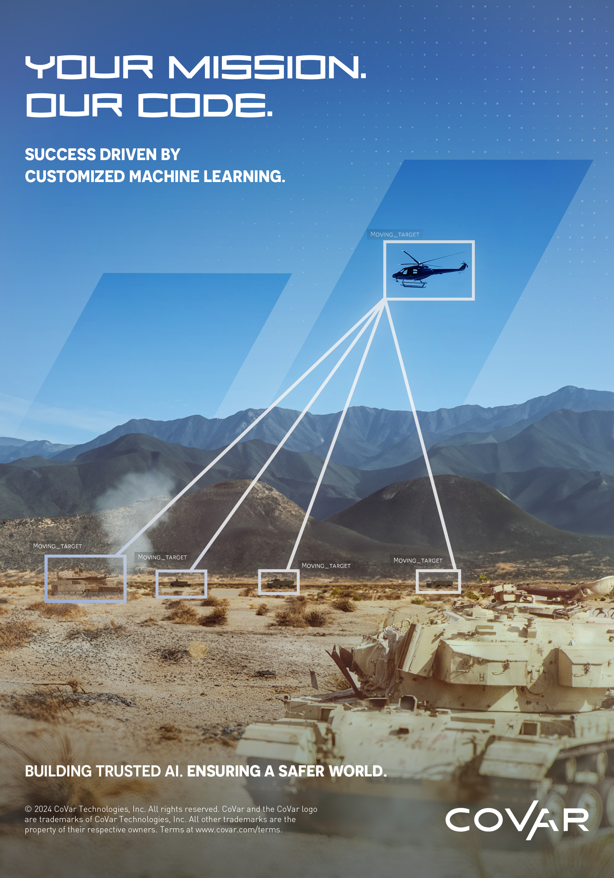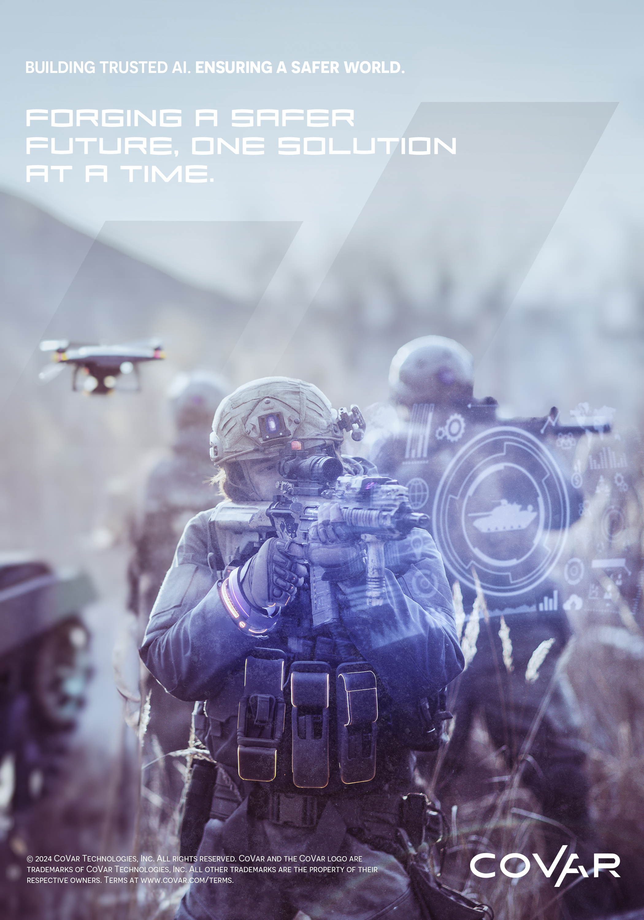 For CoVar's first brand advertising campaign, I was tasked with creating a full-page print and digital ad for Army USA Magazine to establish the brand�s presence in the defense industry. Starting with no existing assets or references, I developed every element from scratch, employing advanced compositing techniques and AI tools like generative fill to create compelling visuals. The goal was to position CoVar as a trusted leader by blending dependability with cutting-edge machine learning. To achieve this, I designed multiple ad versions that featured a strong, photographically-driven art direction paired with crisp, targeted messaging, effectively engaging the defense-focused audience.